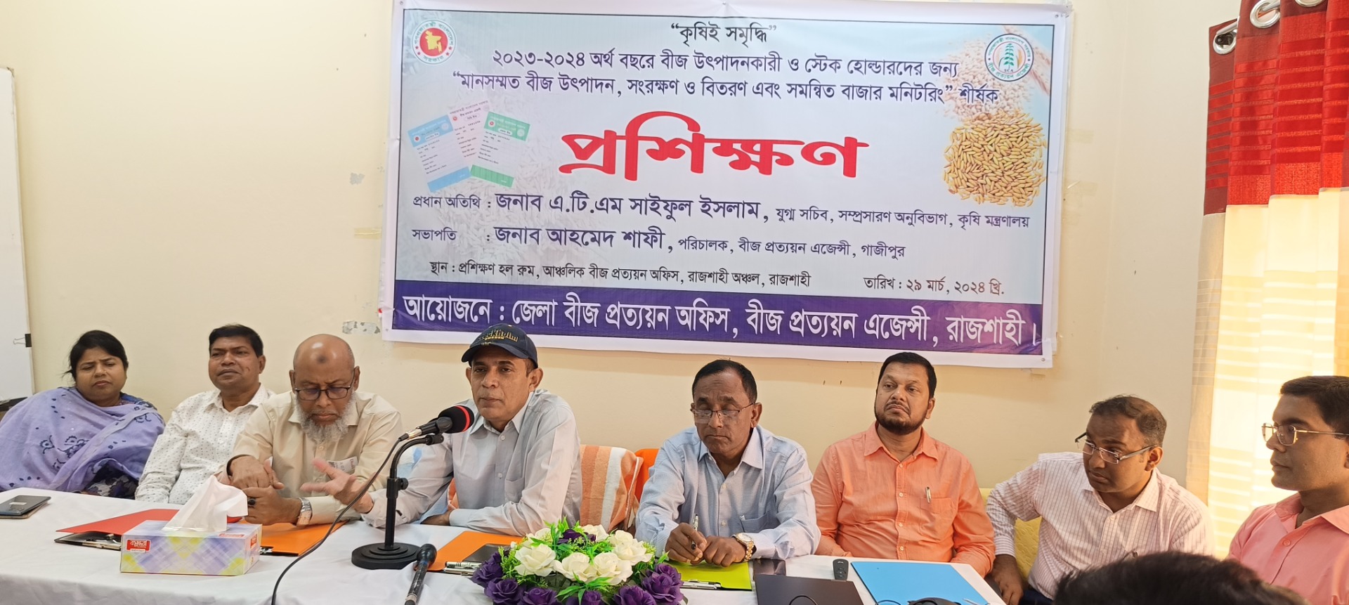 ২৯/০৩/২০২৪ খ্রিস্টাব্দ তারিখে জেলা বীজ প্রত্যয়ন অফিস, বীজ প্রত্যয়ন এজেন্সী, রাজশাহীর আয়োজনে প্রশিক্ষণ হল রুম আঞ্চলিক বীজ প্রত্যয়ন অফিস, রাজশাহী অঞ্চল, রাজশাহীতে ২০২৩-২৪ অর্থ বছরে বীজ উৎপাদনকারী ও স্টেক হোল্ডারদের ‘‘মানসম্মত বীজ উৎপাদন, সংরক্ষণ ও বিতরণ এবং সমন্বিত বাজার মনিটরিং’’ শীর্ষক দিন ব্যাপী প্রশিক্ষণ অনুষ্ঠিত হয়। উক্ত প্রশিক্ষণে প্রধান অতিথি হিসেবে উপস্থিত ছিলেন জনাব এ. টি. এম সাইফুল ইসলাম, যুগ্ম সচিব, সম্প্রসারণ অনুবিভাগ, কৃষি মন্ত্রণালয় এবং সভাপতি হিসেবে উপস্থিত ছিলেন জনাব আহমেদ শাফী, পরিচালক, বীজ প্রত্যয়ন এজেন্সী, গাজীপুর মহোদয়।